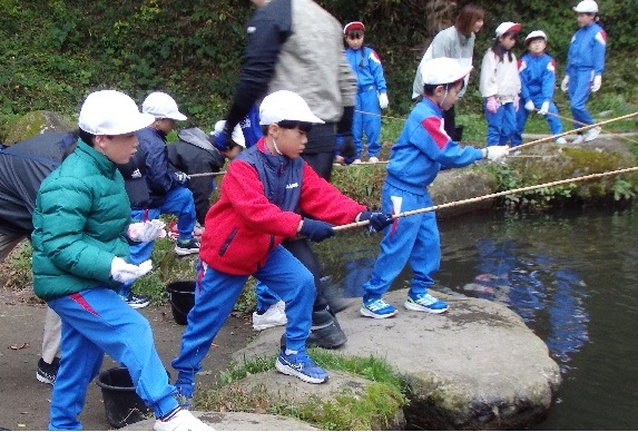 3年生は、自分たちで釣ったニジマスを食べて、箱島のきれいな湧水を飲んだりくんだりして自然の大切さを学びました。