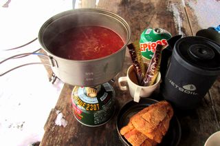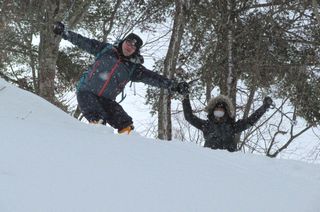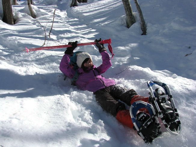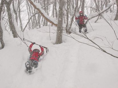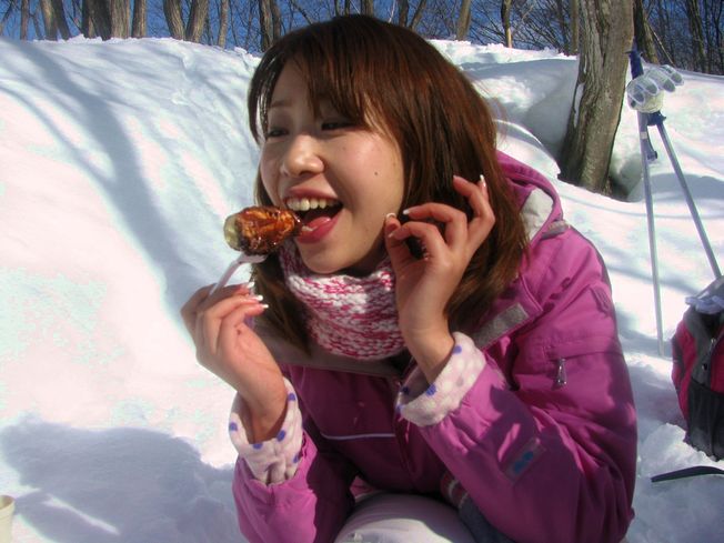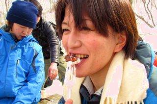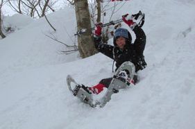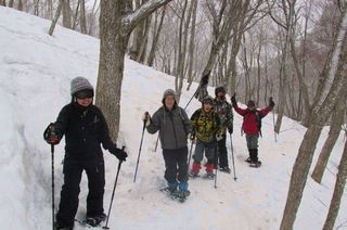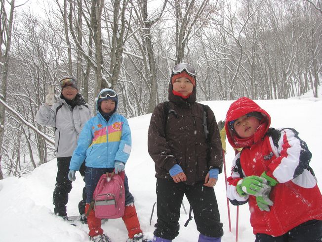 13年1月3日(木) あけましておめでとうございます!! 13年初スノーシューは岩崎さんファミリーと雨呼山を登りました。。急斜面を登ったり、尻セードでお父さんが爆走したり、アドベンチャーファミリーでした。雪原でのランチはスープカレー、ホットワイン、チョコフォンジュ。小雪の降る中のスノーシューでしたが、笑いがいっぱいの楽しいスノーシューでした。 |