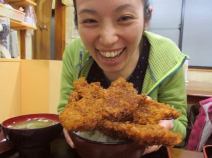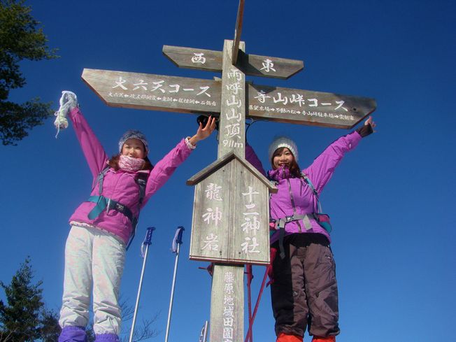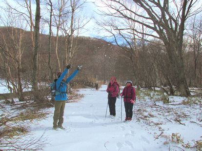 12月11日(水) ベテラン鈴木さん、山ガールよしえちゃん、け○子さんと初冬の山歩きを楽しみました。長七郎山はくるぶしぐらいまでの積雪。パウダースノーなので気持ちよく歩けました。山頂からは富士山、関東平野の向こうに筑波山、南アルプス、八ヶ岳、、、全部見えました。暖かかったので山頂でノンビリお昼。下山後、富士見の温泉に入り、ニコニコ亭のソースカツどんで打ち上げ、よしえちゃんは3枚丼をペロリと食べた!!さぁ〜いよいよスノーシューですよ!! |