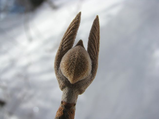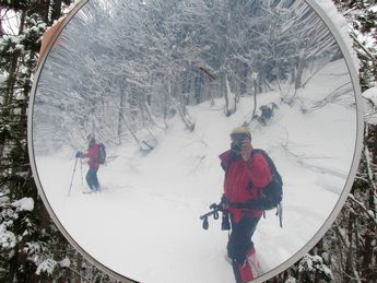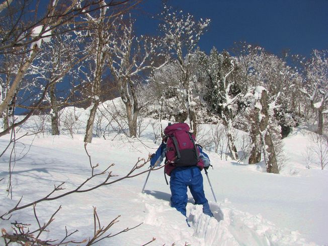 1月8日(火) 青柳さんのプライベートスノーシューで鹿俣山に登ってきました。天気予報は良くなかったが、快晴の中、パンダースノーをじゅうぶんに楽しめました。。静かなブナ林は癒されました。オオカメノキの新芽が春を待つように、幼葉がそっと包んでいました。山頂で展望を楽しみながらのお昼。さぁ〜、いっきにに駆け下りて温泉だ!! |