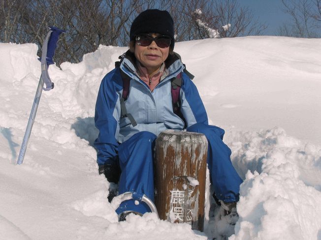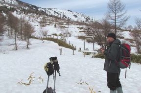 3月23日(土) 稲福さん、きょうはバースディースノーシュー。おめでとう!!ちょっと遠くの湯の丸山まで足を伸ばしました。カラマツ林を登山道を離れてシュートカット。鐘の所でお昼。ここから一気に山頂へ。50分で登る。浅間山の噴煙、本白根山、八ヶ岳、、、素晴らしい展望でした。鐘の所まで15分で下りる。男ふたりでは体育会系のトレーニングのようなスノーシューになりました。 |