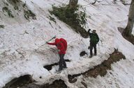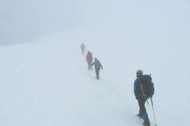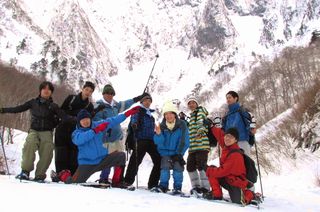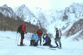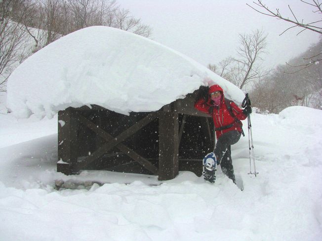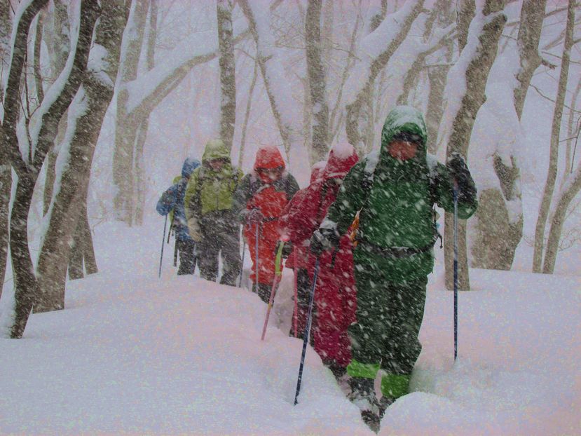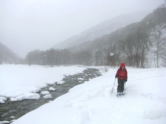 1月20日(日) 松戸の山岳会、緑山会の人たちと一の倉沢にスノーシュー。パワフル緑山会は吹雪の中、元気いっぱいに土合橋を出発。マチガ沢を渡渉すると、いっきに猛吹雪になり、しかも新雪の膝上ラッセル。交代しながら、出合に到着。何も見えない!すぐに引き返しマチガ沢の東屋でお昼。さすが名門緑山会、吹雪の中、ラッセルして一の倉沢出合まで行きました。素晴らしいチームワークでした。 |