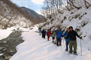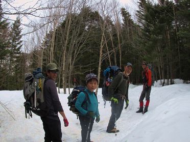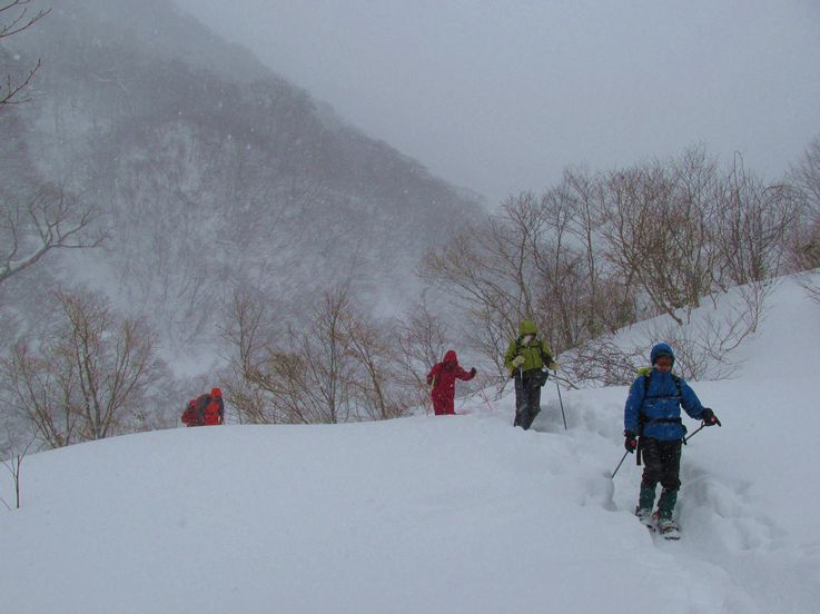 2月18日(月) 大塚さん、熊澤さんと一の倉沢にスノーシュー。小雪が舞う中、湯檜曽川に出て、誰も歩いていない雪原に、自分たちのトレースをつけながら歩く、気持ちいい!!マチガ沢で夏道に戻り、あの急斜面を突破しブナ林に出る。静かな癒されるブナ林の雪原、サイコー!!一の倉沢の岩壁は見られなかったが、冬山の登山教室のようにいろんなテクニックを覚えていただきました。 |