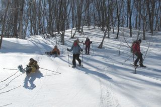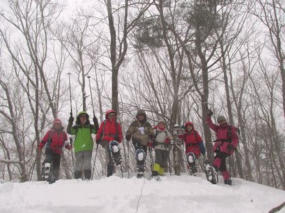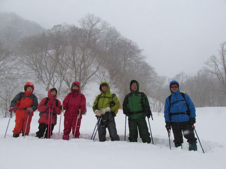 2月6日(水) 越谷市の山グーループ山楽会の皆様と、常連で今年2回目のスノーシューフリーク青柳さんと尼ヶ禿山に登りました。雪が降ってはいましたが、風がなく、パウダースノーのラッセルも楽しい!!山頂でお昼を食べ、思い思いにスノーシューダウンヒルを楽しみながら下山。雪景色のブナ林はきれいだった。展望は楽しめなかったが、いっぱい雪遊びした1日でした。 |