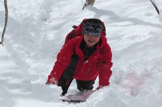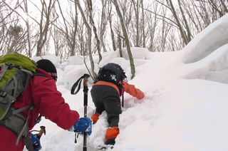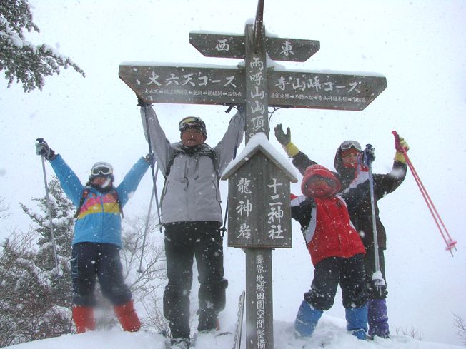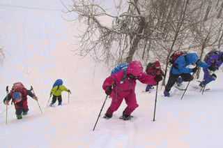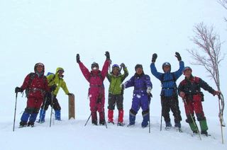 3月10日(日) アドベンチャーファミリー庄司さんご家族と雨呼山でアトラクションパークのように遊びました。出発時はポカポカ陽気。熊だなや氷筍見たり、何度も尻セードしたり、急斜面を駆け下りたりしました。政五郎山頂直下もお母さんがラッセルして突破。スッゴイッ!!お姉ちゃんは暴走気味に尻セード。お兄ちゃんは何回か滑落。雨呼山頂上は猛吹雪。天気の急変に冬山の恐ろしさも体験しました。 |