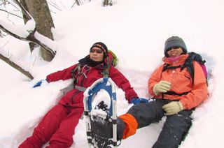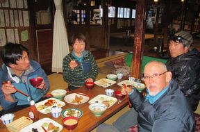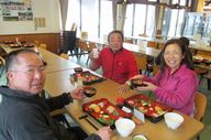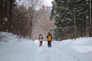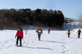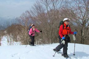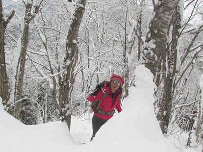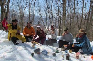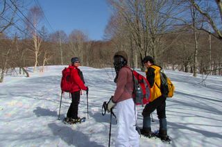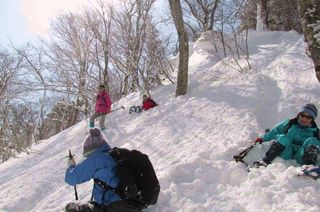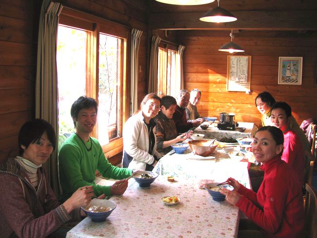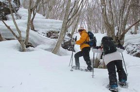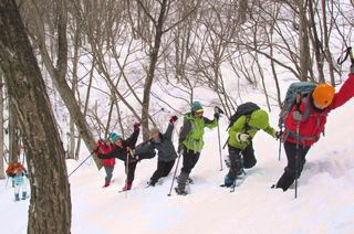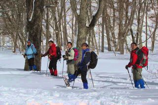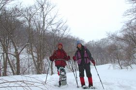 1月6日(日) 鈴木さんと一の倉沢へスノーシュー。雪が降る中のスノーシューでしたが、マチガ沢で夏道をアタックしながら登り、静かなブナ林に出ると、シンシンと降りつむ雪の中、静寂な雰囲気に心が癒されました。レインボーに戻って、高橋トレーナーや別荘の石井さんたちと「とろろご飯のランチパーティー」。楽しいオシャベリタイムが延々と続きました。 |