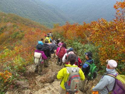 10月14日(月、祝) 下田さんご夫妻と紅葉の谷川岳に登りました。天神平8;00出発。登山者が行列をなして登っている。天気は良いが、山頂あたりに雲がかかってきた。紅葉と景色を楽しみながらノンビリ歩く。熊穴沢避難小屋からは休憩なしで山頂へ。霧の中、風が強く寒い。肩の小屋では4度。すぐに下山。途中、陽だまりでお昼にする。たくさんの登山者が秋の山を楽しんでいた。やはり谷川岳は良い山だ。 |