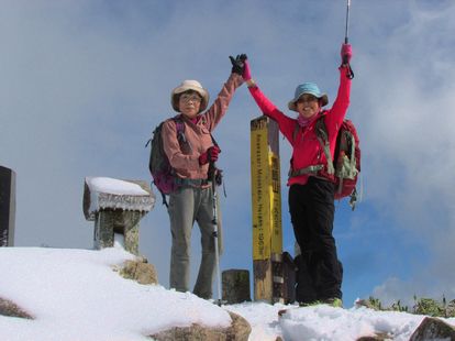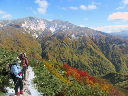 10月17日(木) 雨飾山は雪でした。鈴木さん、森川さん、け○子さん、登山口を8;30出発。紅葉の始まったブナ林はすがすがしい!荒菅沢は台風の影響で増水し、引き返すグループもいたが渡渉する場所を探し渉る。稜線からは青空、純白な雪、そして紅葉、見事な三段染めは感動的な景色でした。ササ平からは本格的な雪道で、山頂直下の岩場はアイゼンなしで突破。皆さんのと登山技術はすっごいです! |