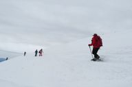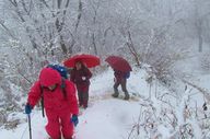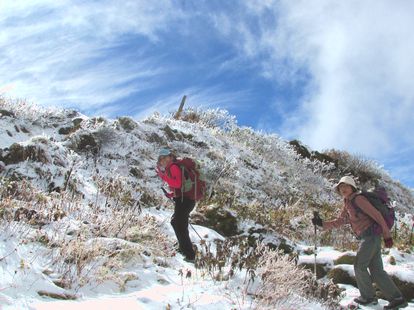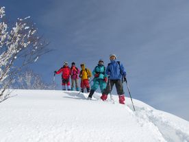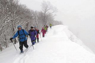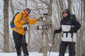 1月28日(月) 石崎さん、川崎さん、緑川さん、雨呼山でスノーシュー。出発時は青空の中、アップダウンのコースを、難なくクリアー。山頂直下の急斜面を登り方の練習をしながら突破。技術の習得が素晴らしい!!お昼を食べ、氷筍を見たら、吹雪になった。スノーシューダウンヒル、尻セード、たくさん遊んだ、楽しさいっぱいのスノーシューでした。 |