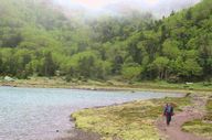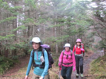 6月22日(土) 関東以北の最高峰、日光白根山に浅岡さんと登りました。霧雨が続くなか、イワカガミやミネザクラ、シラネアオイが雨に濡れ、光り輝いていました。山頂は行列状態。記念写真を撮り、広場でお昼。寒い!五色沼に下りるコースを歩く。鹿が出てきて食事中。写真を撮ったり話しかけたりしたが、シカトされた。新緑と花の気持ちよい山歩きでした。 |