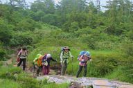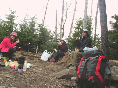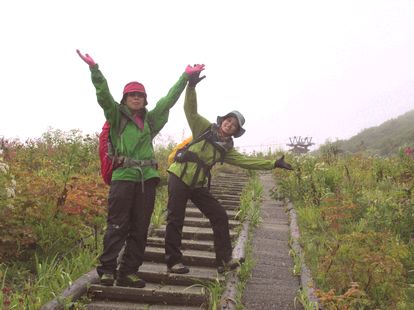 8月27日(火) 6時朝食。外は雨。止みそうなので、しばし停滞。みんな朝寝を楽しむ。いびきをかいてた人がいたかも、、、。雨が止み9時前に出発。山頂湿原を散歩し、ベンチでモーニングコーヒータイム、至福の時間がゆっくり流れる。展望が開け、湿原が現れ池溏やワタスゲ、キンコウカが輝き、遠くの山並みも見えた。ほぼ1時間遊んで下山。山に包まれ歩き、緑のシャワーに心も癒され、花も景色もトークも楽しかった。渡辺さん、横尾ちゃん、きわこちゃんありがとう!!また、歩こうぜ!! |
