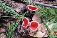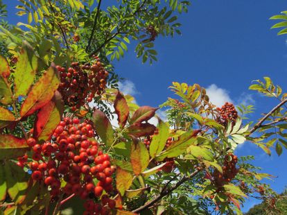 10月6日(日) け○子さんと上田富士(飯士山)に登る。登山道では、ナナカマドの赤い実が青空に輝いている。秋の風の冷風が気持ちいい!山頂まで20分ぐらいの時、誰もいないのに、け○子さんがしゃべっている。「早く行きなさい!!お父さんが来るから逃げなさい!」「どうした?」「まむ子ちゃん(まむし)が登山道から逃げないの。」「オレ、帰るっ!」「え〜ここまで来て帰るの。」「オレ、待ってるから一人で行けばっ!」というわけで、ふたりで下山。野の花館の花談義楽しかった。 |