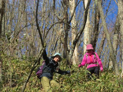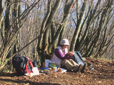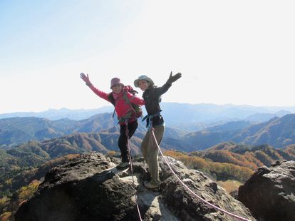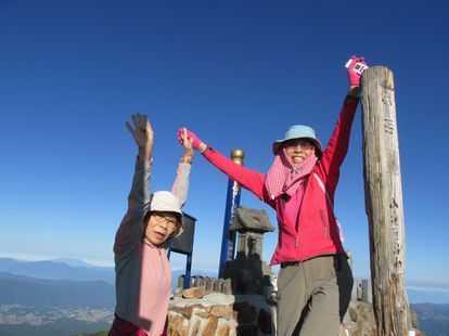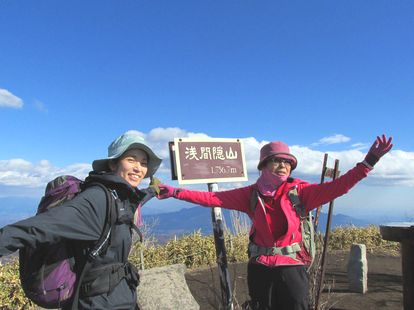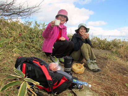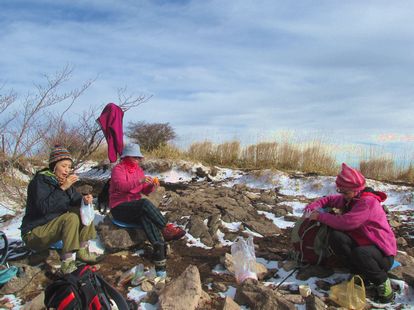 11月20日(水) 鈴木さん、よしえちゃん、晩秋のノンビリ癒し山行は浅間隠山。この山は何度登ってもホッと癒される気持ちよい山だ。流れる時間がゆっくり感じられる。きのう登った妙義山がきれいに見える。目の前の浅間山は白銀に輝き、谷川連峰も光ってた。山頂直下の陽だまりでお昼。お勧めの梅昆布茶は飲んでもらえず、ココアがご所望。帰りは藪こぎも経験した。晩秋の山歩きホント楽しい! |