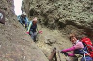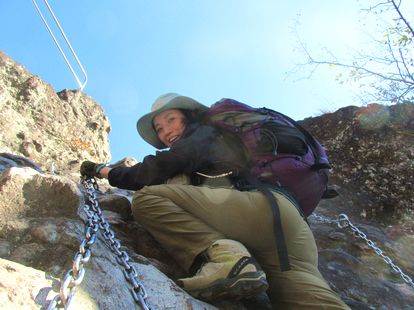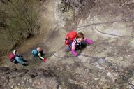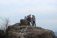 4月20日(土) 妙義山に柴田さん、金沢さん、山岸さんと石門めぐりを楽しみました。まず、轟岩のてっぺんにロープで確保して登り、桜の里を上から楽しみました。第四石門まではノンビリ歩き、お昼をゆっくり食べ、いよいよ岩登りの本格的コース。大砲岩まで行ったり、カニの横ばいなど、ミニ剣岳のようで面白かった。ミツバツツジのピンクがきれいでした。 |