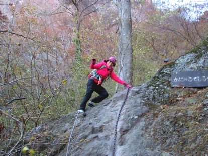 11月19日(火) 山のベテラン鈴木さんとピッチピチの山ガールよしえちゃん、妙義山の石門めぐりをしました。「石門めぐりは車窓から?」、「いえいえ、ロープを使った岩稜歩きですよ」、と珍門答から始まった晩秋の山歩きでした。風が強く、吹き溜まりには落ち葉が山のように積み重なって、両手ですくって放り投げると遠くまで飛んでいった。もみじの湯で汗を流し、楽しい夕食へ向かった。 |