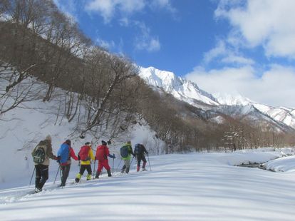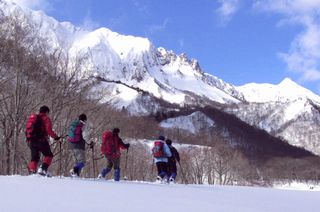 2月4日(月) HRKのアイドル、ユーコチャンとその親衛隊の皆さんで一の倉沢へスノーシュー。青空のもと、気温も高くポカポカ陽気で気持ちよい、スノーシューでした。一の倉沢の岩壁も全景が見渡せ、感動しました。帰り道、蓬峠の白銀が輝いていたり、武能岳の鋭峰も見えました。若さはじける皆さんは、走ったりロング尻セードを何回も楽しみました。心地よい疲れ、癒されますね。 |