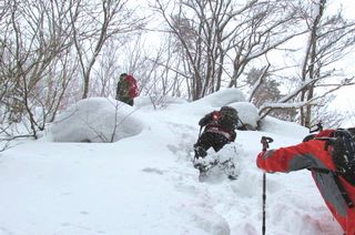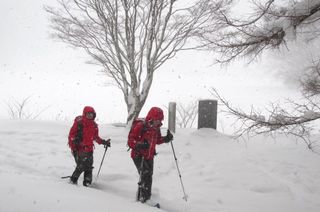 3月3日(日) 昨夜来の吹雪で、最高のパウダースノーのスノーシューができました。ベテラン中村さん、今村さんのコンビで雨呼山。新雪のラッセルは、羽毛布団を土足で歩く、感じ。政五郎山頂直下の急斜面、今村さんがひとりでアタックし、突破。ひと汗かいて雨呼山に向かう。龍棲洞の氷筍も素晴らしかった。大人の雪遊びを、じゅうぶん楽しんだ1日でした。 |