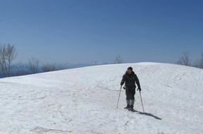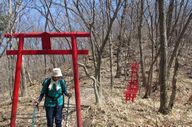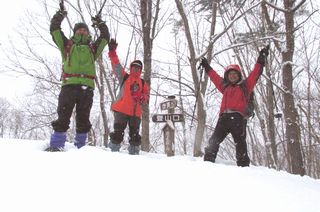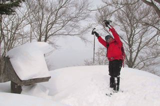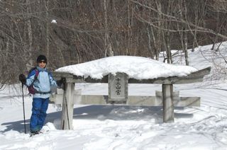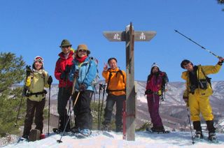 2月28日(木) 森川さんのプライベートガイドで尼ヶ禿山にスノーシュー。雲ひとつない快晴のもと、新雪を踏んでノンビリ歩きました。神社の鳥居が埋まりそうになっていたり、休憩小屋の屋根に腰掛けて休んだり、積雪じゅうぶん過ぎるくらいでした。山頂からは八ヶ岳、浅間山、谷川岳連峰が白銀に輝いていた。もうこれ以上ないような景色に、じゅうぶん楽しんだスノーシューでした。 |
