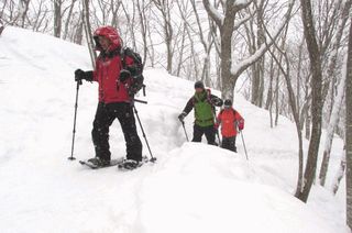 12月27日(金) ベテラン鈴木さんのスノーシュー足慣らしに、湯の小屋(奈良俣)に行ってきました。天気がイマイチなので展望はあきらめ、ブナ林をノンビリ歩く。尾根を何回か越し、林道に出る。もうひとつ尾根を越せば奈良俣湖だったが、おなかが空いてお昼にする。トマトスープのリゾットは冷めた体に心地よく美味しかった。カモシカ、テン、キツネ、ウサギ、動物の足跡だらけで、野生の天国みたい。 さぁ〜、スノーシューは本格的にシーズンインですよ!! |