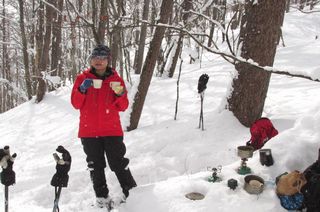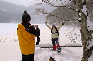 2月16日(土) 渡辺さん、横尾さん、いつも楽しい仲良しコンビと一の倉沢に向かったが、猛吹雪で、比較的天気の良い大峰沼に変更。薄日も差し、おだやかなノンビリスノーシューができました。休憩にはホットチョコーレートハグ。お代わりもしてすっごく美味しかった。ホットチョコレートにJDとマシュマロを入れると、身体が芯から温まり、ほっとする。NYの冬の定番、レインボーでもいけるかもよ。 |