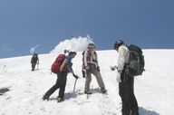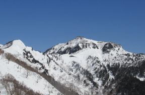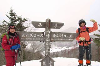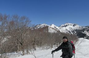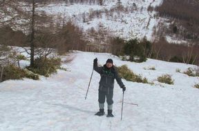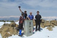 3月22日(金) 数年前、はるばる沖縄からファミリーで来られた稲福さん、今回はひとりでスノーシュー。展望を楽しむため、鹿俣山に登る。春のしまった雪は、気持ちよくクランポンがきまり歩きやすい。崩れそうな雪庇を避けながら山頂へ。遠くに富士山、浅間山の奥に北アルプスまで見えた。目の前には剣が峰山(そういえば今年は登ってないなぁ〜。)いつまでも頂上にいたかった。 |