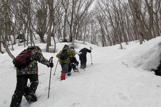 3月14日(木) きのうと同じ、渡邊さん、小暮さんと雨呼山へ。きょうは寒気が入ってきたのか、寒い。尾根を何度も乗り越え、熊だなや氷筍見たりスラーイダーで遊んだり、笑い声がこだまする。政五郎山頂直下の、一番の急斜面を、おふたりでルートファインディングしながら突破。スノーシューの登り方や下り方などを説明しながらの、登山教室みたいなスノーシューになった。お疲れ様でした。 |