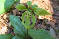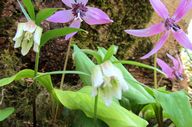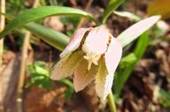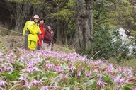 4月28日(日) ベテラン山ガールの浅岡さん、東北の山をいっしょに歩いた福田さん、坂戸山と六万騎山でスプリングエフェメラルのカタクリ、ミスミソウを楽しみました。サクラとカタクリの競演、イワウチワ、イワナシ、タムシバ、イカリソウ、、素晴らしかった。右の写真の緑色のカタクリ発見!すっごく珍しいらしい。野の花館の外山さん、娘さんを交えて、花談義。山、花、美術館、全部楽しみました。 |