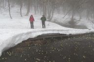5月11日(土) 今シーズン最後のスノーシュー、尾瀬ヶ原に鈴木さん、関田さんと行ってきました。鳩待峠は霧雨。積雪は1mはあり、登山道をはずれ、急斜面を尻セードで下り、川上川の岸辺を歩く。テンマ沢の所の湿原のミズバショウが咲きだし、小さくて妖精のようだ。山小屋に早く着いたが、雨が本降りになったので、散歩を止めて2時過ぎにはオシャベリと宴会。なが〜い夜になりそうで心配だ。 |