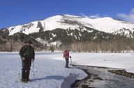 2月7日(木) 最近ガッツリ系のスノーシューが続いたので、きのうと同じ青柳さんと、ノンビリ癒し系のスノーシューということで、大峰沼に行きました。ポカポカ陽気の中、熊棚見たり、カモシカ、テン、キツネの足跡を追いかけたり、楽しかった。大峰沼に陽が当たり輝いていてきれいでした。お昼は、トマトソースのリゾット、ココアの新メニュー。ノンビリ癒されたスノーシューでした。 |