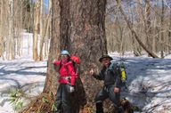 5月12日(日) 朝から雲ひとつない快晴!8時出発の予定が、鈴木さん、関田さん、心がウキウキ早く出発した。湿原を思い思いのコースを歩く。すっごく子持ちいい!下の大堀川の水芭蕉の絶景地は(写真中央)水の中でミズバショウが咲きだしていた。湿原を横断し、猫又川上流の、日本で2番目に太い天然落葉松を見に行く。登山道がないので積雪期しか行けない。さすが立派でした。楽しかった! |