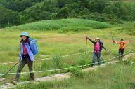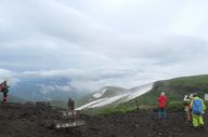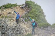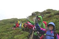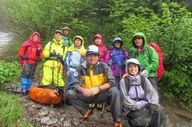 8月1日(木) 夕べから雨。ドシャ降り。5時朝食で雨脚が弱まるまで停滞。山ガールたちはストレッチなのかセクシーポーズなのか何かやっている。6時半出発。雪渓で登山道整備していたガクさんに遭遇。全員がハイテンションになり、記念撮影。なんと20分ぐらい、いっしょに歩き見送ってくれた。感激!!天気に恵まれ、たのしく歩けた3日間の爺ヶ岳と鹿島槍ヶ岳でした。みなさんありがとう!! |