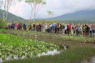 6月8日(土) ミズバショウが最盛期の尾瀬ヶ原です。このところ、尾瀬学校やツアーのガイドで尾瀬に行っています。今日が一番の混雑でした。ポスターにもなる、下の大堀川のビューポイントは大混雑していました。尾瀬ヶ原はミズバショウが終わると、たくさんの花が一気に咲きだし、お花畑になります。楽しみです。 |