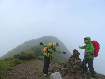 9月5日(木) 5時朝食、7時前五竜山荘を遠見尾根へ出発。霧雨の中、西遠見山、大遠見山と越えていく。やっぱり長いなぁ〜。雲間から五竜岳が見え、幻想的な景色に、しばし眺めていた。小遠見山あたりで休憩中、誰かさんがパイナップルの缶詰をひっくり返す事件発生。最後まで、面白い事件や楽しいエピソード満載の山歩き、ありがとう。鈴木さん、よしえちゃん、また歩こうぜ。 |